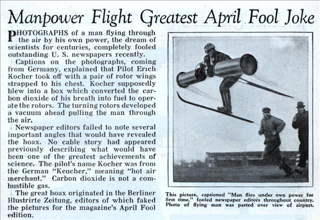 1934: Man Flies By Own Lung Power หนังสือพิมพ์อเมริกันหลายฉบับลงข่าวชายผู้สามารถบินได้ด้วยลมจากปอดตนเองร่วมกับเครื่องมือที่เก็บลมที่เขาเป่าออก