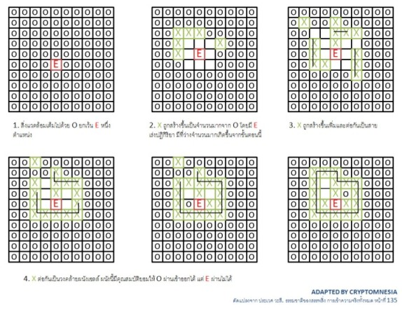 5.E และ X สามารถคลื่อนไปแทนที่ O ได้ โดยดันให้ O ไปอยู่ที่ว่างถัดจากตำแหน่งเกิม นอกจากนี้ E ยังแทนที่ X ได้ในลักษณะเดียวกัน